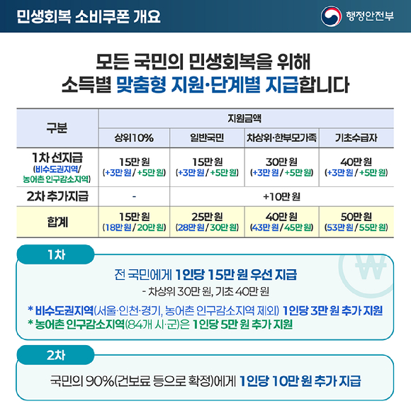 - 전 국민 1인당 기본 15만 원 자동 지급 (7월 21일부터)